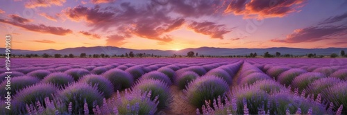 © Prasert, Fototapeta premium A field of lavender flowers at sunset, with the sky turning pink and orange, botanical, wildflowers, flowers