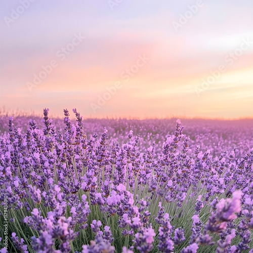 Naklejka premium A field of lavender flowers in full bloom under a pastel-colored sky.