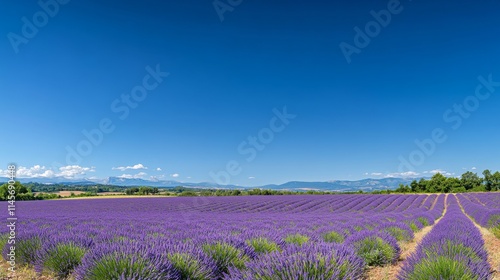 Naklejka premium A field of lavender in Provence under a clear blue sky, wide-angle shot,...
