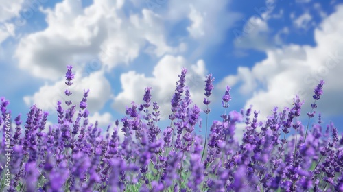Naklejka premium A field of lavender stretches towards the sky, the vibrant purple flowers contrasting with the soft white fluffy clouds above.