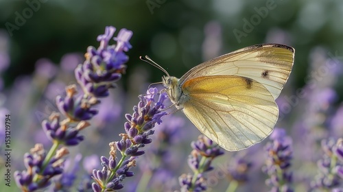 Naklejka premium A field of lavender with a lone butterfly resting on a flower, delicate wings...