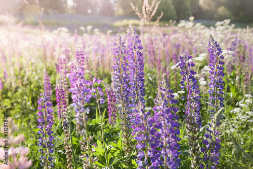 © Tatiana Nurieva, Naklejka premium A field of lupines. Violet and pink lupin in meadow. Colorful bunch of lupines summer flower background or greeting card. Summer meadow with blooming lupins.