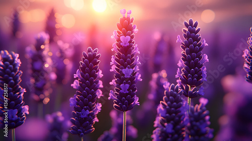 Fototapeta premium A field of purple lavender flowers with the sun shining on them