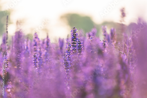 © AS_SleepingPanda, Naklejka premium A field of purple spider flower blooms gently sways in the soft morning light, showcasing delicate petals and vibrant hues against a hazy, warm background, creating a serene and natural scene.