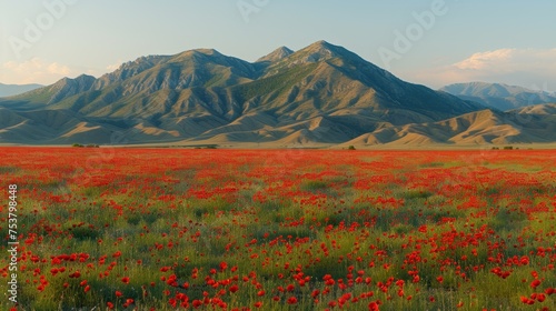 © Liel, Fototapeta premium a field of red flowers in front of a mountain range with green grass and red flowers in the foreground.