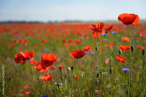 © Jakob, Fototapeta premium A field of red poppies with blue flowers in the background