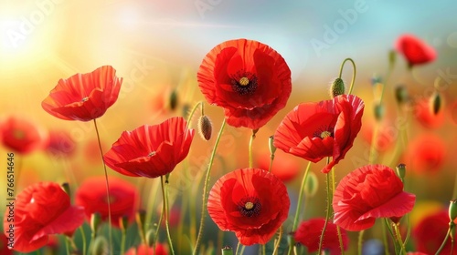 © vefimov, Fototapeta premium A field of red poppies with the sun shining on them
