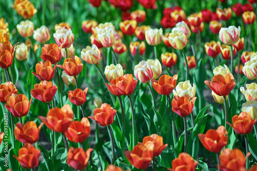 © A, Obraz premium A field of red tulips on a sunny day. Concept Spring