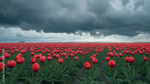 Fototapeta premium A Field of Red Tulips Under a Dramatic Cloudy Sky