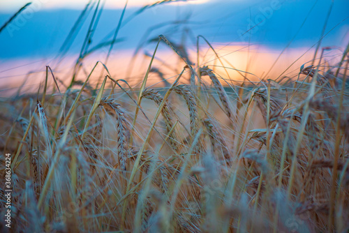 Fototapeta premium A field of ripe wheat ears. Close-up photographed.