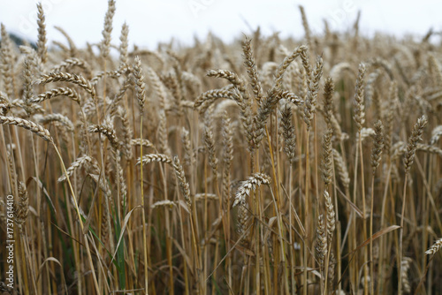 Fototapeta premium A field of ripe wheat ready for harvest under a cloudy sky.