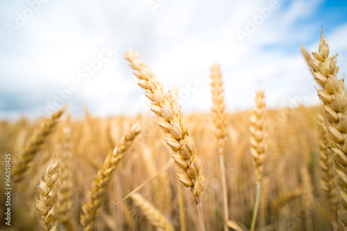 © luchschenF, Fototapeta premium A field of ripe wheat road and a blue sky with clouds. Panoramic view