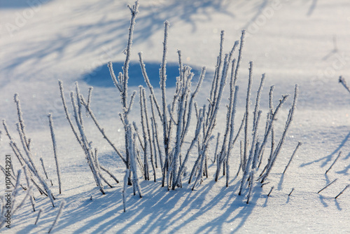 © schankz, Fototapeta premium A field of snow covered plants with frost on them
