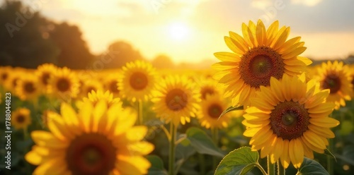 © Sathaporn Buarabut, Obraz premium A field of sunflowers bathed in golden sunlight, their faces turned towards the sun, creating a vibrant and warm scene The rich, saturated color evokes feelings of joy and summer , calm, petals