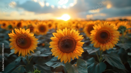 © easybanana, Obraz premium A field of sunflowers in bloom with the sun setting in the background.