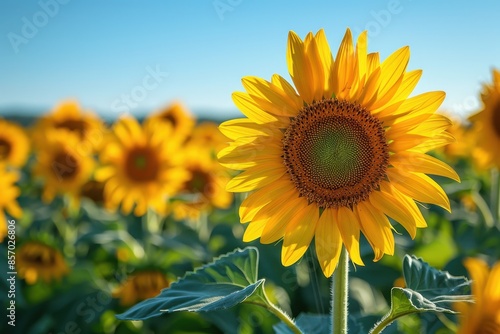 Fototapeta premium A field of sunflowers in full bloom, with a clear blue sky overhead.