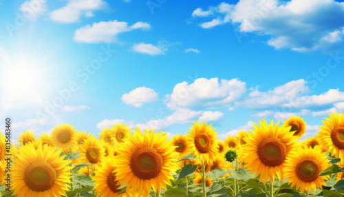 Fototapeta premium A field of sunflowers with a bright blue sky in the background