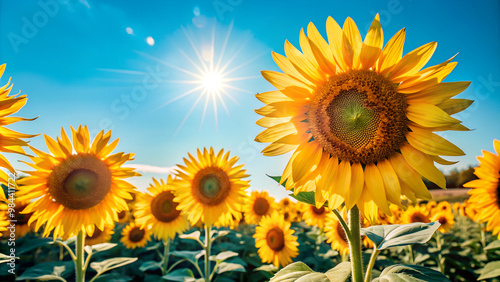 Fototapeta premium A field of tall, bright yellow sunflowers in full bloom, stretching towards a clear blue sky
