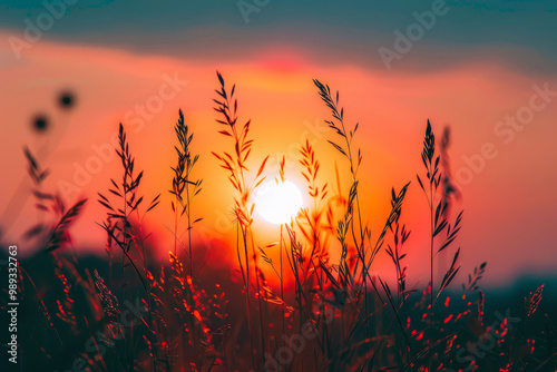 © mila103, Fototapeta premium A field of tall grass with a sun in the sky