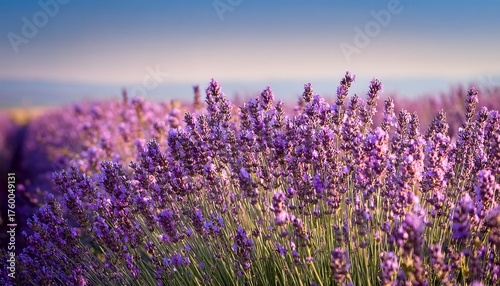 Naklejka premium A Field Of Tiny Purple Lavender Flowers Blooms In Summer With An Aromatic Fragrance The Intense Violet Colored Flower Blooms Are On Thin Green Stems There S A Pale Blue Sky In The Background
