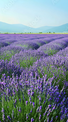 © Lailatul, Naklejka premium A field of vibrant lavender flowers in bloom, stretching towards the distant mountains under a clear blue sky.