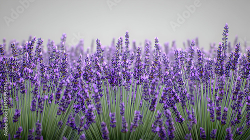 © jam, Naklejka premium A field of vibrant purple lavender flowers. Close-up view of numerous lavender spikes against a soft, light gray background. The image conveys a sense of calm and tranquility