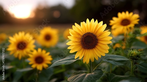Naklejka premium A field of vibrant yellow sunflowers bathed in the warm golden light of...