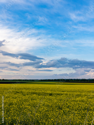 © VISUAL BACKGROUND, Obraz premium A field of yellow flowers under a blue sky with clouds