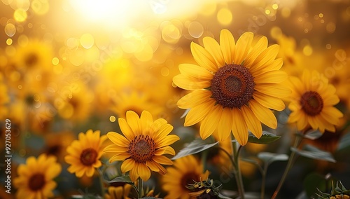 Fototapeta premium A field of yellow sunflowers with a bright sun in the background