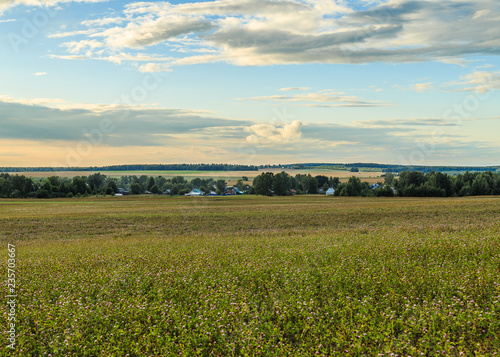 © vredaktor, Fototapeta premium A field planted with clover, on the horizon visible village