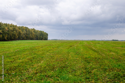 Fototapeta premium A field where grass is grown for hay in autumn. Pasture for animals.