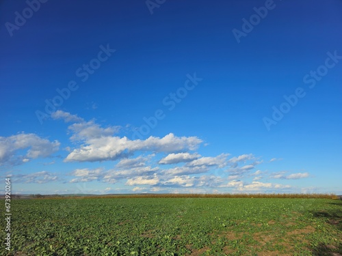 © parpalac, Obraz premium A field with blue sky and clouds