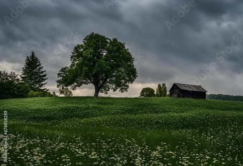 © Wirestock, Obraz premium a field with grass, tree, and houses in the distance