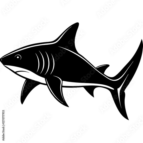 © CraftteeSVG, Obraz premium A fierce black and white illustration of a great white shark swimming in the ocean