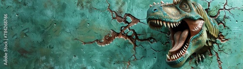 Fototapeta premium A fierce dinosaur head breaking out of a green wall