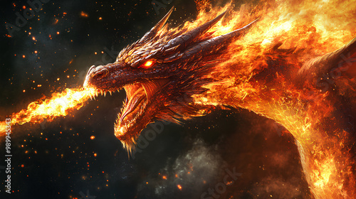 © Derry, Naklejka premium A fierce dragon breathing fire, set against a dark, smoky background.