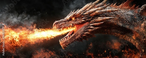 Naklejka premium A fierce dragon breathing fire, showcasing mythical power and fantasy...