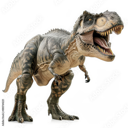 © AI_images, Obraz premium A fierce Majungasaurus with its robust build and sharp teeth, ready to strike, isolated on white background.