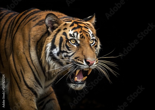 © Yauhen, Fototapeta premium A fierce Malayan tiger baring its teeth with an intense gaze isolated on black background