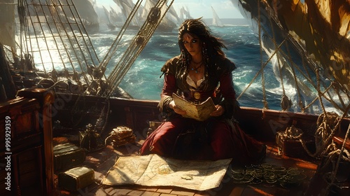 Fototapeta premium 22. A fierce pirate captain on the deck of a ship, maps and treasure around her