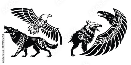 Fototapeta premium A fierce silhouette of a mythical creature combining a wolf and eagle, decorated with symmetrical tribal tattoos in ancient Mayan style, black vector art