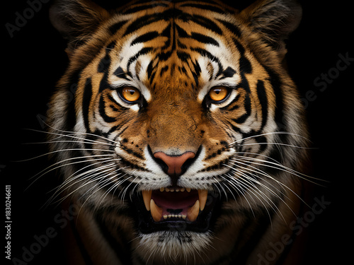 Naklejka premium A fierce tiger emerging from darkness, emphasizing focus and predatory...