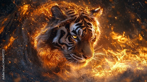 Naklejka premium A fierce tiger surrounded by flames, symbolizing strength and power.