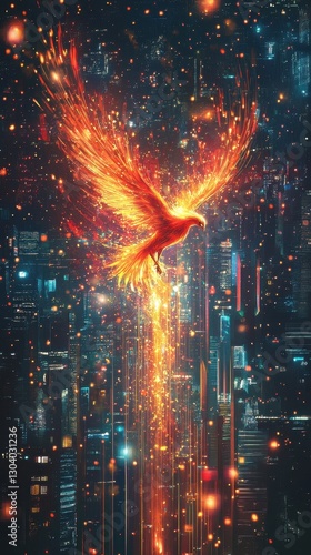 Fototapeta premium A fiery bird ascends from the city skyline at night