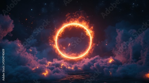 Obraz premium a fiery celestial ring emerging above turbulent waters under a starry night...