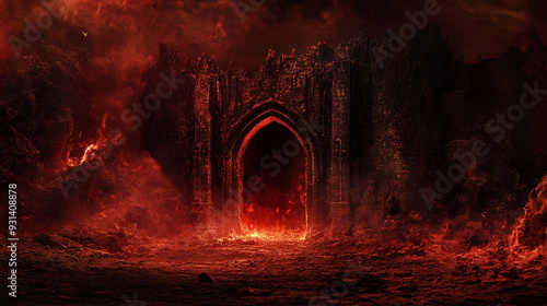 © Sadia, Obraz premium A fiery entrance to a dark realm surrounded by molten lava and jagged rocks at twilight