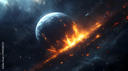 © Siasart Stock, Obraz premium A fiery explosion erupts on the surface of a planet in space.