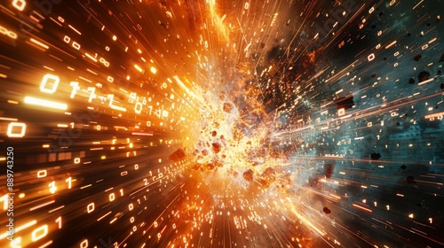 Naklejka premium A fiery explosion in a digital space, filled with glowing binary code and streaks of light.