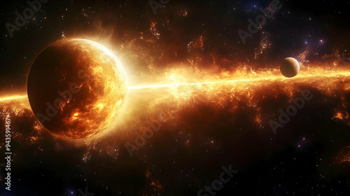 © Siasart Stock, Obraz premium A fiery explosion in space with two planets, one engulfed in flames.