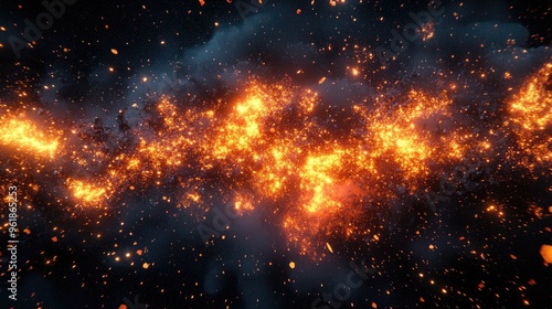 © 69, Fototapeta premium A fiery explosion of particles with glowing sparks flying in all directions, creating an intense visual effect on dark background